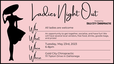 Dr. Tolbert and Gold City Chiropractic is hosting another LADIES NIGHT OUT! Bring your friends and join us for free goodie bags, food, drinks, and door prizes! We are excited about the opportunity for the ladies of Dahlonega to get together, socialize, and have fun! We have several local vendors attending! Admission is FREE!